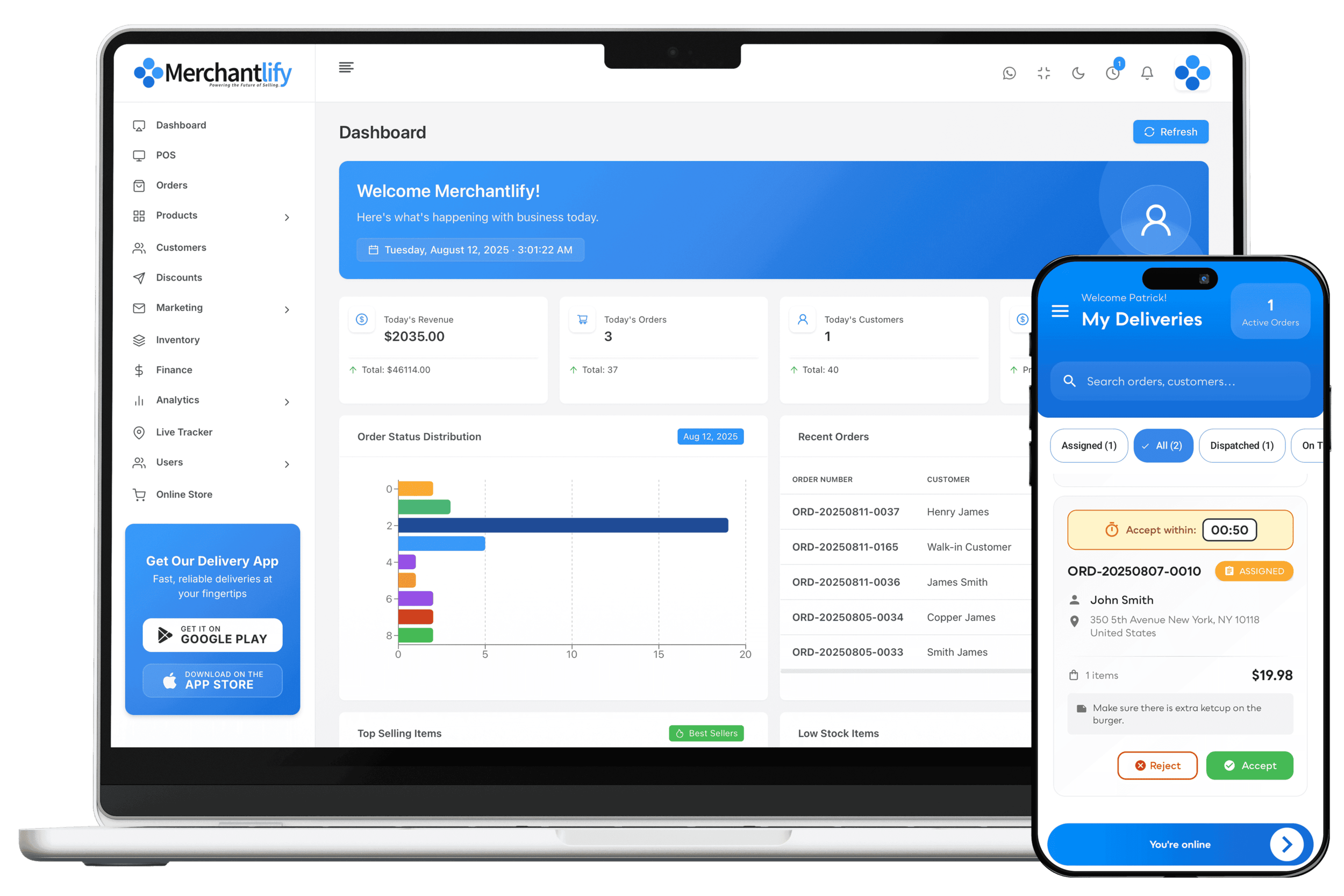 Connect with Merchantlify Delivery to manage your own fleet. Live driver tracking, automated dispatch.